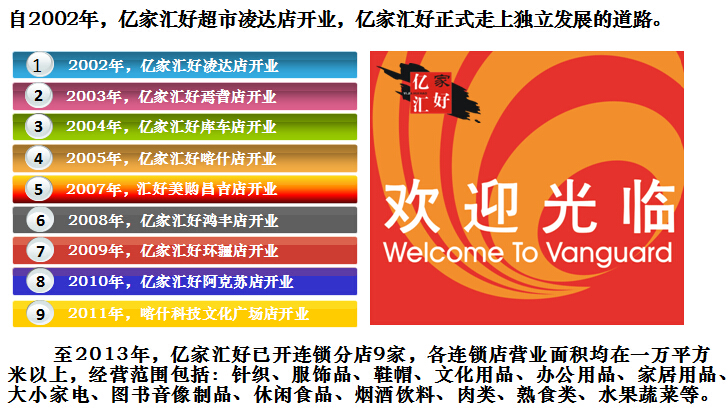 億家匯好商貿(mào)有限責任公司于2002年成立,并從臺灣引進連鎖經(jīng)營職業(yè)管理團隊,統(tǒng)一管理旗下各地的連鎖超市。公司通過多年的穩(wěn)健發(fā)展,至2013年底,億家匯好商貿(mào)有限責任公司已成為擁有員工近3000多人,下轄一個配送中心和9家連鎖超市的大型綜合性零售企業(yè)。總經(jīng)營面積11萬多平方米,配送中心輻射公司所有超市,年配送額可達2億元。公司大量吸納下崗職工,經(jīng)過崗前培訓,提高勞動技能,實現(xiàn)了他們的再就業(yè),為維護社會和諧穩(wěn)定做出了貢獻。2013年,巴州億家匯好商貿(mào)有限責任公司在自治區(qū)零售業(yè)中穩(wěn)踞前三位,是自治區(qū)重要的流通龍頭企業(yè),2013年年銷售收入達10億人民幣。多年來,公司一直重管理、抓實效、運用先進的管理手段和營銷理念,秉承億家匯好人 時時尋求效率創(chuàng)新,事事講究專業(yè)技術的文化精髓,創(chuàng)造了良好的經(jīng)濟效益和社會效益。公司先后多次被消費者協(xié)會評為誠信單位,并多年被評為重合同,守信用單位。
